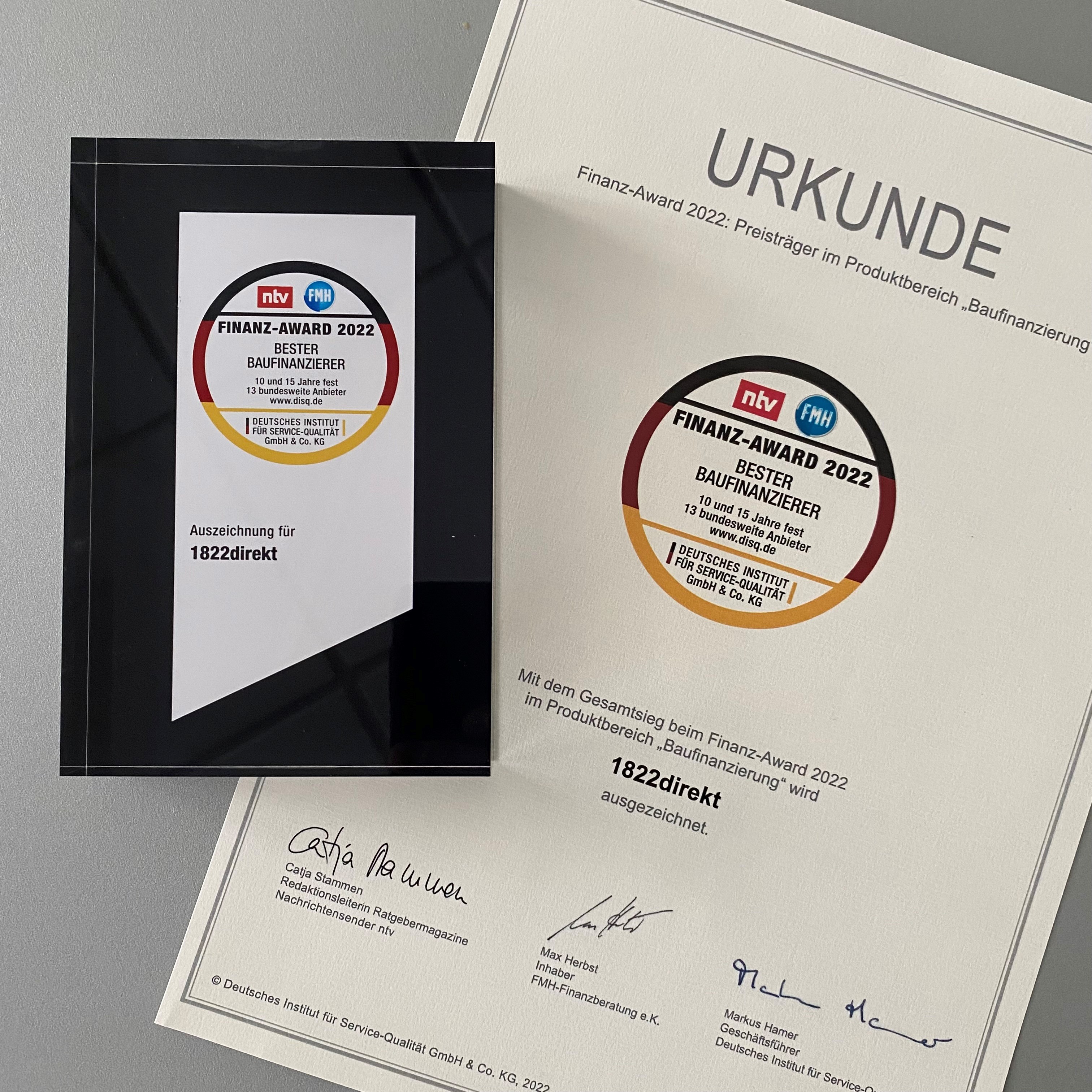 Das Deutsche Institut für Service-Qualität (DISQ), die FMH-Finanzberatung sowie ntv haben auch in diesem Jahr wieder den Finanz-Award in bereits zehnter Auflage verliehen. Die 1822direkt ist dabei im Produktbereich Baufinanzierung (10 und 15 Jahre fest) führend und wurde erneut mit der renommierten Auszeichnung prämiert.